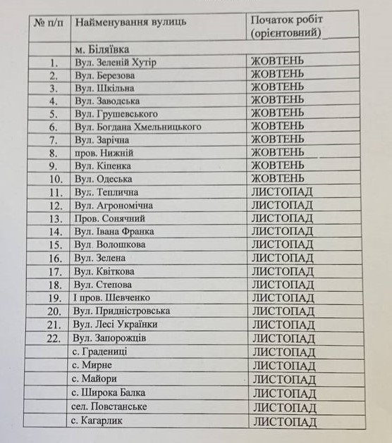 КП “Наш дім” інформує: Графік проведення робіт по грейдеруванню доріг в Біляївській міській територіальній громаді. 16.10.2025